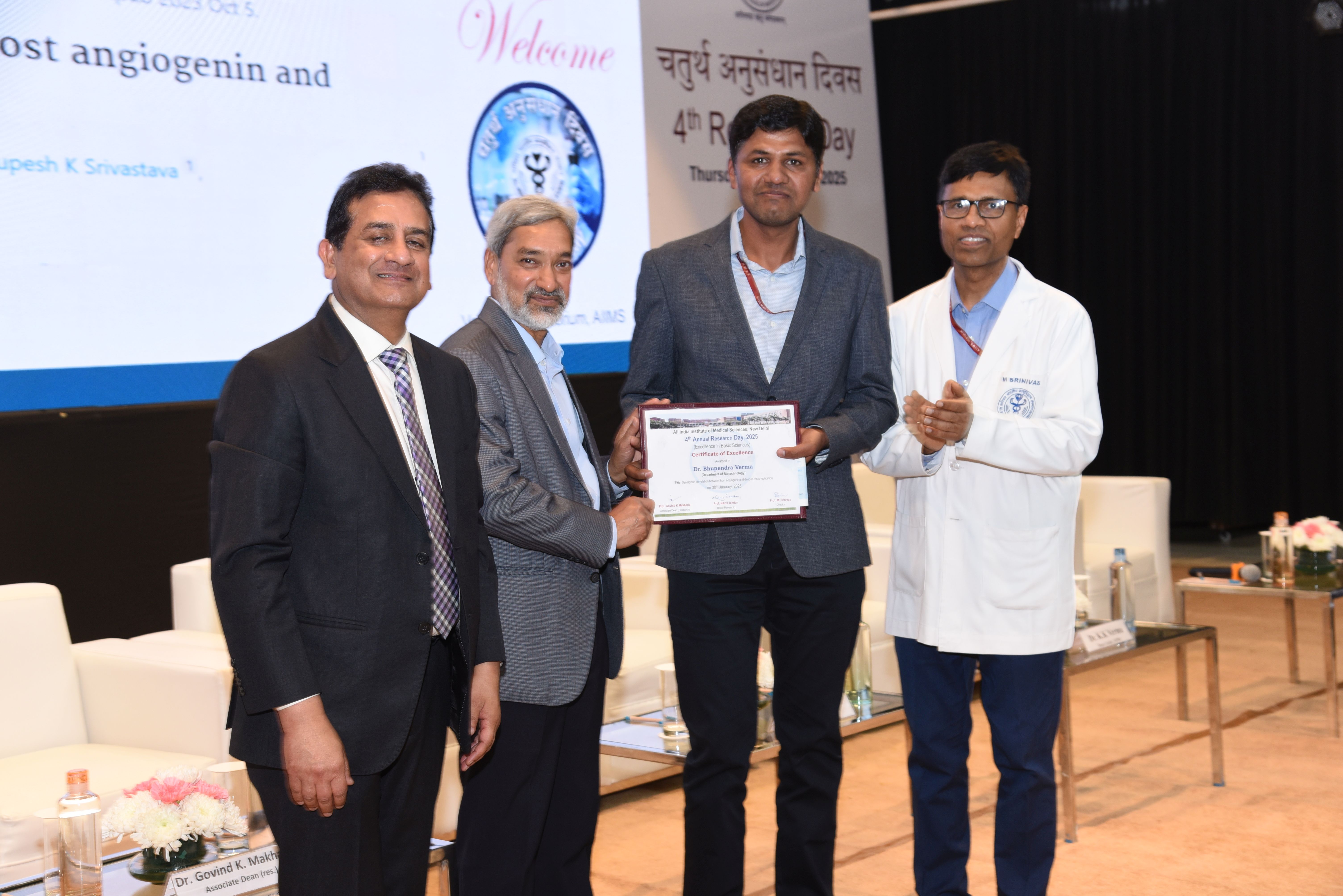 Dr. Bhupendra Kumar Verma received Commendation Prize for Excellence in Basic Sciences Title: Synergistic correlation between host angiogenin and dengue virus replication "4th AIIMS Annual Research Day on 29th & 30th January, 2025 at JL Auditorium, AIIMS, New Delhi" |