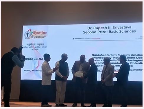 Dr. Rupesh K. Srivastava (Translational Immunology, Osteoimmunology & Immunoporosis Lab (TIOIL)) received 2nd Prize for Excellence in Basic Sciences Title: Lactobacillus Rhamnosus (LR) Arrelorates Pulmonary and Extrapulmonary Acute Respiratory Distress Syndrome (ARDS) via Targeting Neutrophls "4th AIIMS Annual Research Day on 29th & 30th January, 2025 at JL Auditorium, AIIMS, New Delhi" |